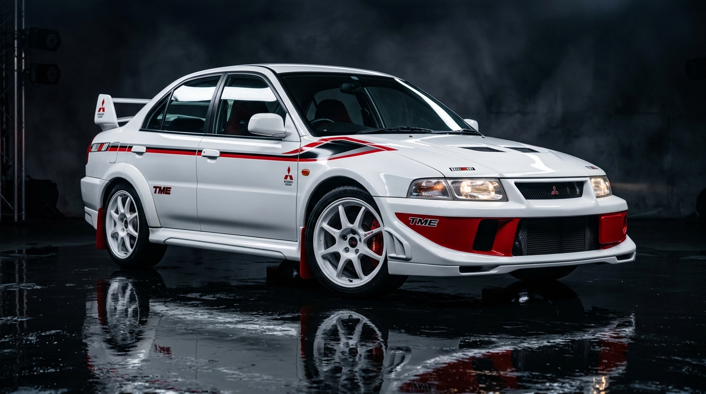 Named after Tommi Mäkinen, who won four consecutive WRC titles in the Evo. The TME (Tommi Mäkinen Edition) was the homologation special: titanium turbo, close-ratio gearbox, stiffer suspension, and AYC tuned for oversteer. At 1,360 kg with 280 hp and 373 Nm, the Evo VI TME was the most rally-ready Evo you could buy with a warranty. Mäkinen's signature car, and the one collectors fight over.